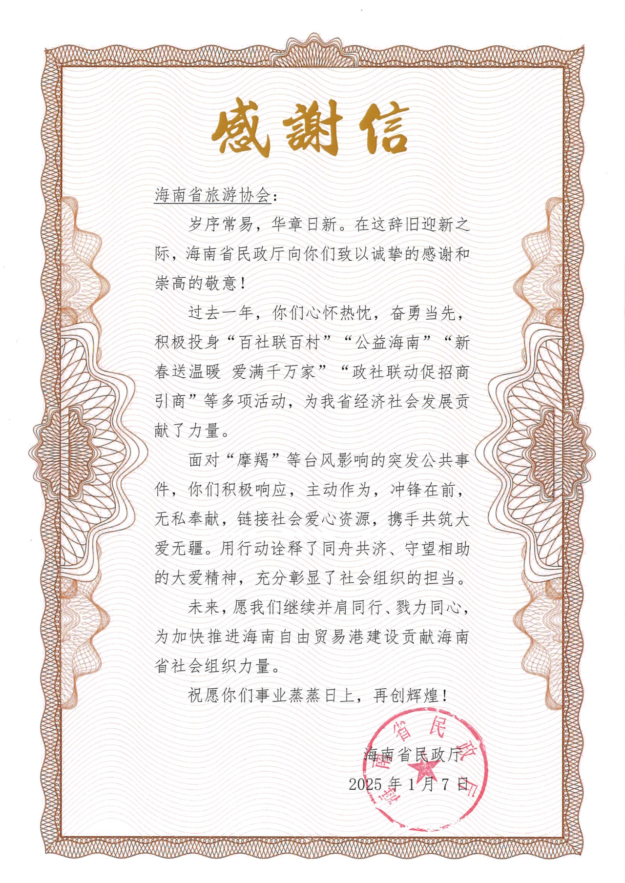 2月28日,海南省民政厅向海南省旅游协会发来感谢信,对协会过去一年在社会公益、应急救灾和乡村振兴等领域作出的突出贡献给予高度赞扬。2025年,海南省旅游协会将不负期望,坚定不移地扛起新时代社会组织的使命担当,在海南自贸港建设的宏伟征程中,充分发挥自身优势,凝聚行业力量,为海南自贸港建设注入强劲动能,共同绘就海南发展的崭新篇章。