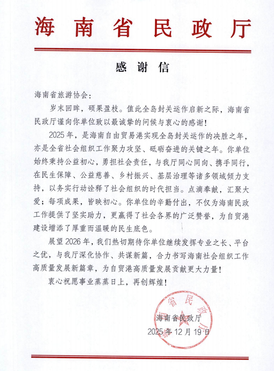 海南省旅游协会收到了来自海南省民政厅的感谢信。字里行间的认可与期许,成为协会在自贸港建设征程中深耕民生服务的又一动力。2025年,海南省旅游协会在省旅文厅、省民政厅的大力指导支持下,在全体会员单位的协同配合下,在公益慈善、基层治理等领域积极作为,为海南民政工作提供了坚实助力。