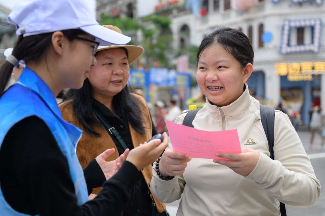 “文明旅游,从我做起,爱护环境,不乱扔垃圾,不破坏公物,不损毁文物……”在“20 秒文明宣言挑战”现场,游客们争相领取宣言文稿,在志愿者的引导下开启朗读挑战。大家声音洪亮、态度端正,争分夺秒又流畅完整地诵读宣言,不少小朋友也主动参与其中,用稚嫩的声音传递文明力量。“成功啦!成功啦!”来自吉林的彩洁小朋友在20秒内顺利读完宣言获得了一张南湾猴岛景区门票。