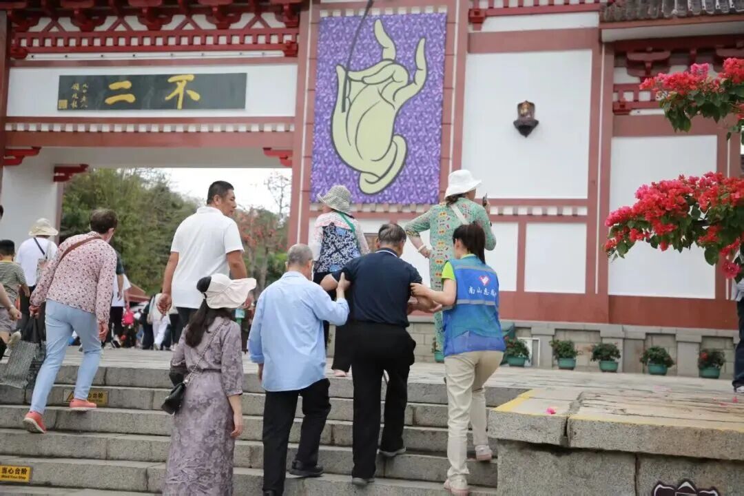 三亚南山文化旅游区志愿者搀扶行动不便的老人