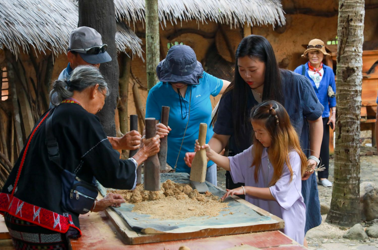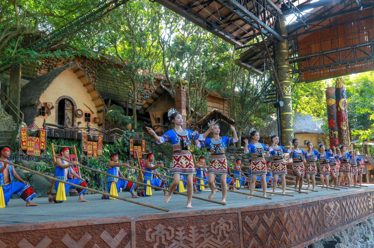 二是文化静态展示创新。通过“五感叙事”强化沉浸感,突破文化展示静态陈列的固有方式。游客可触摸百年谷仓群的竹木结构,聆听鼻箫演奏的本土旋律,品尝用山栏米酿制的甜酒,甚至参与钻木取火的体验。这种“可触摸的文化”使槟榔谷区别于传统民俗村,形成“人在景中走,文化心中留”的独特体验。